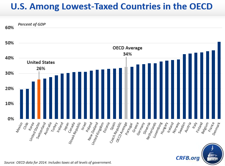 Still, compared to the rest of the developed world, the total US tax burden (Federal, state and local) is just 26% of GDP. That compares to an OECD average of 34% and upwards of 50% in many of the more "advanced" venues of European socialism (e.g. Belgium, France and Denmark).