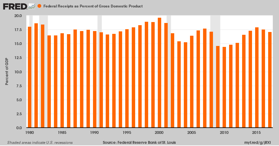 The upcoming FY 2019 is a quintessential expression of that sentiment. Federal taxes will clock in at just 16.5% of GDP – virtually the lowest rate in the last 40 years outside of deep recessions.