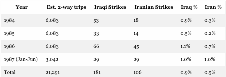 And while light damage occurred to this tanker traffic occasionally owing to missile strikes after the Tanker War incepted, the total number of strikes during the next 42 month period by the Iraqi aggressor was 181 or just under 1% of the cumulative tanker traffic during the period. At the same time, the comparable numbers for Iran was 106 strikes and 0.5% of two-way traffic thru Hormuz.