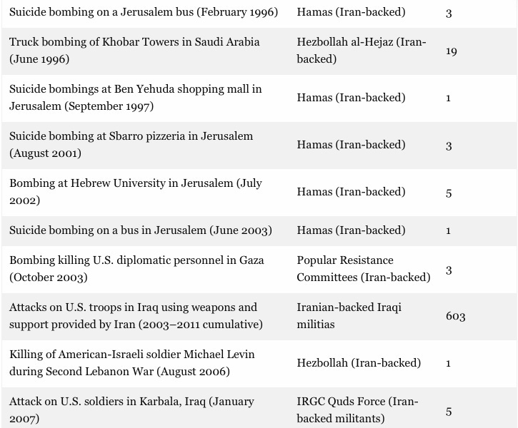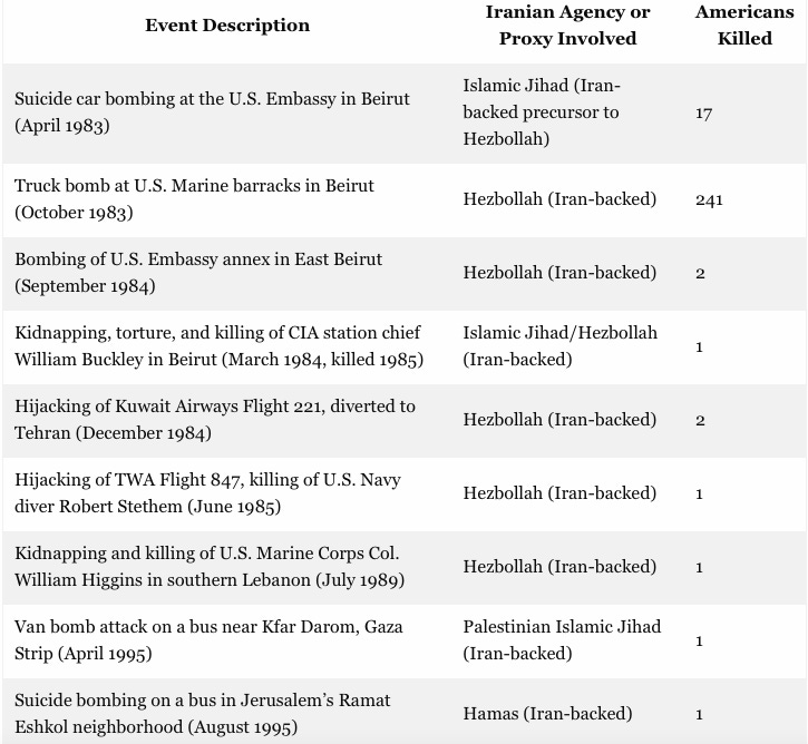 The table below lists every event between 1979 and the present that allegedly gave rise to Iranian murders of Americans—along with the numbers of purported victims and the circumstances of the attack. Some of these are far fetched, indeed, but to give benefit of the doubt we included each and everyone of them.