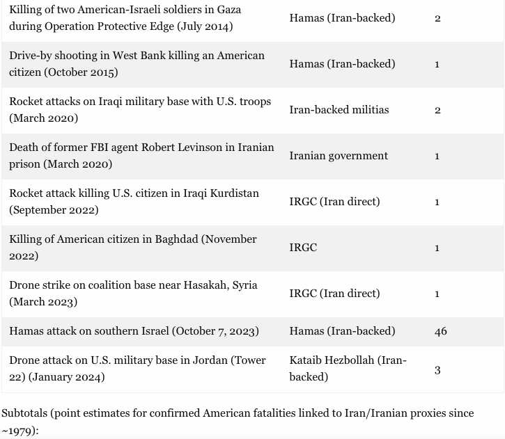 ³ Direct actions only (e.g., Karbala planning/execution, Levinson death in custody, select direct strikes); vast majority of fatalities are via proxies.