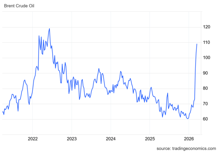 We therefore needs turn to the Brent marker crude oil price, which is the economic thermostat that measures conditions in global energy markets based on worldwide supply, demand and inventory factors. And what we can see is that Brent is already back up to nearly $110 per barrel, which is the zip code where global crude oil peaked during the June 2022 inflationary blow-off.