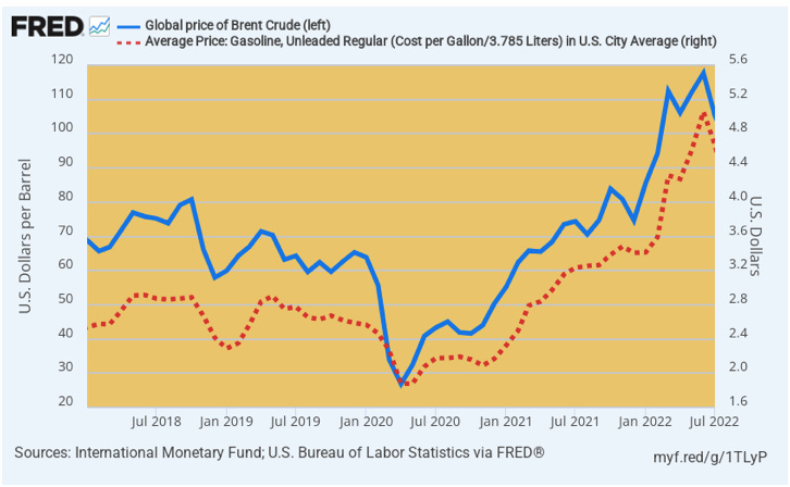 Brent Market Crude Versus US Unleaded Regular Gasoline, 2018 to 2022