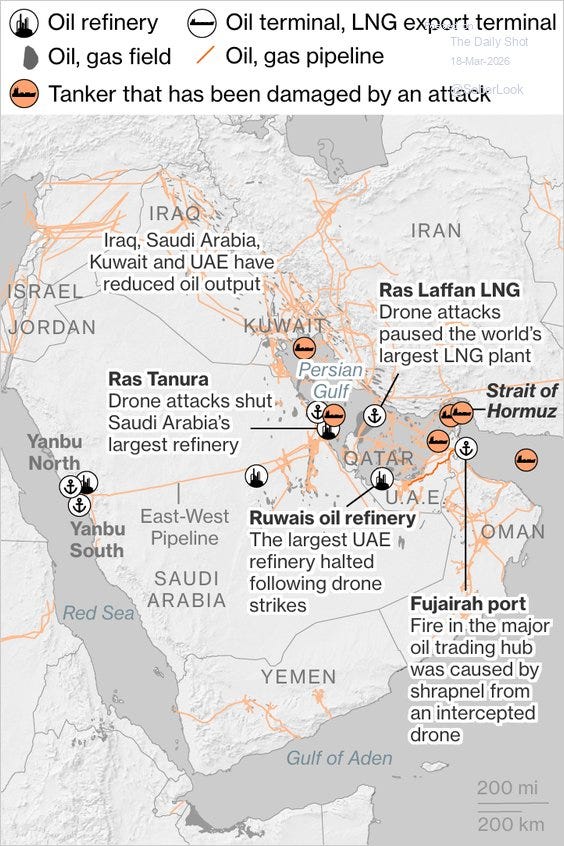 As shown by the map below, the Persian Gulf may soon go up in flames entirely. And that means not just continued blockage of crude oil and refined product flows, but also a blockage of major shares of global trade in LNG, LPGs ( primarily propane and butane used for cooking and heating), sulfur, nitrogen fertilizers and helium which is vital for semi-conductor production, among others.