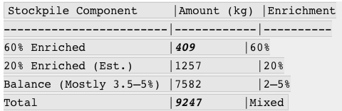 That is to say, most of the 2015 stockpile was generated as a bargaining chip, and that was exactly its fate. Upon activation of the JCPOA in 2015, all of the 20% material was destroyed as certified by the IAEA.