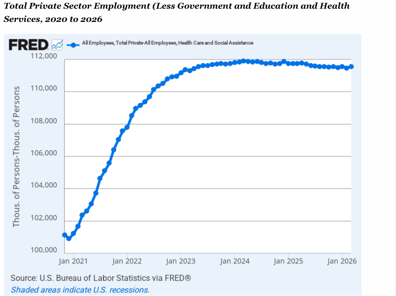 And yet, that’s actually not the half of it. Since December 2024, total non-farm employment has grown by just +321,000 jobs. Yet during the same 15- month period, employment in the government financed private education, health and social services sector has risen by +856,000!