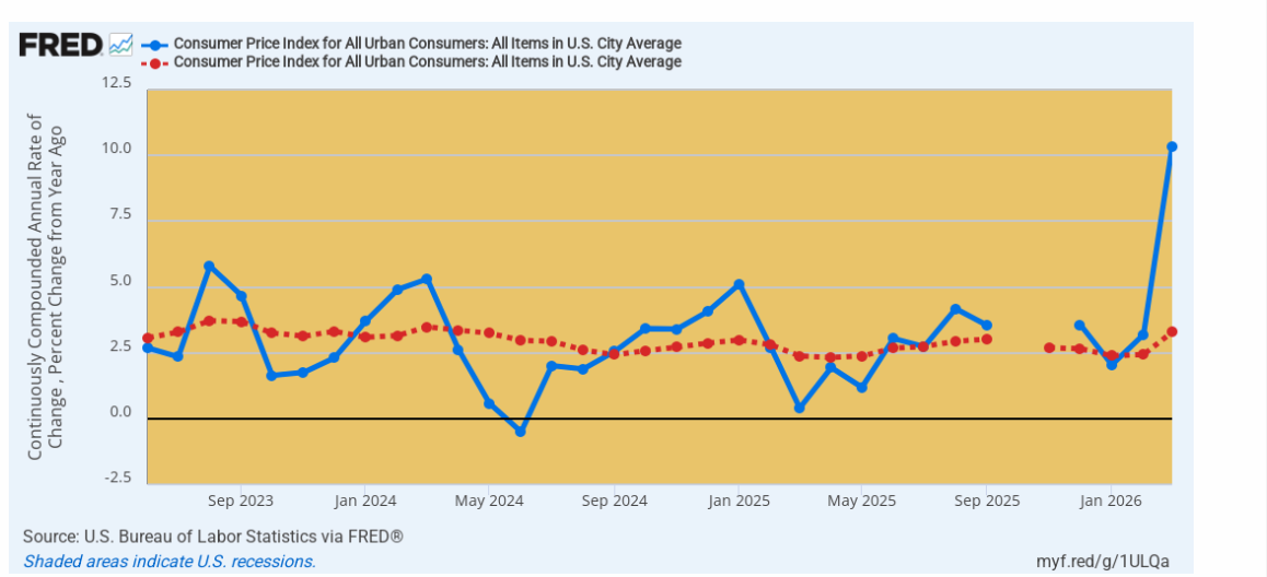 In any event, there has been no improvement in the headline CPI since then–either when measured on a annualized monthly basis (blue line), which was up by +10.3% in March, or on the slower moving Y/Y measure (dotted red line). In fact, the latter posted at 3.29% in the just released BLS report for March 2026, which was up from 3.07% in June 2023.