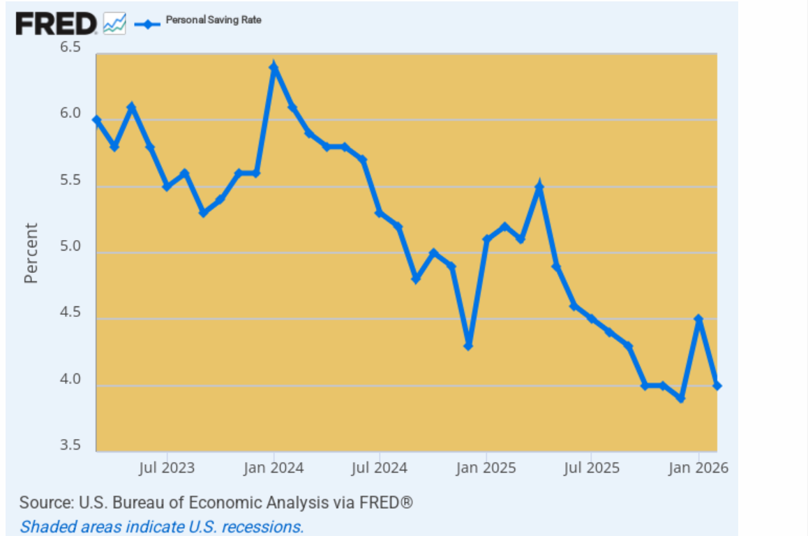 Not surprisingly, with inflation climbing steadily higher and job growth tepid at best, main street households have resorted to their time old default of last resort: Namely, they have drawn down theirsavings rates from the low levels that already prevailed under Sleepy Joe. Accordingly, the meager 4.0% rate recorded in February is among the lowest observations during the last half century.