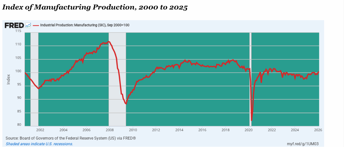 As for Trump’s allegedly “red hot” manufacturing renaissance, you certainly can’t find that in the actual numbers, either. The index of US manufacturing output, in fact, stood in February 2026 at the exact spot it occupier in September 2000.