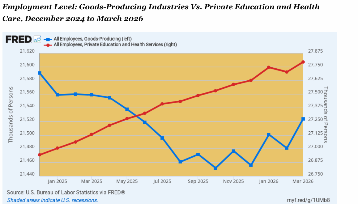 On that score, the table below leaves little to the imagination. The number of jobs in the private education, health care and social services sector (red line) has risen by +850,000 since December 2024, while goods-producing jobs are down by -67,000.