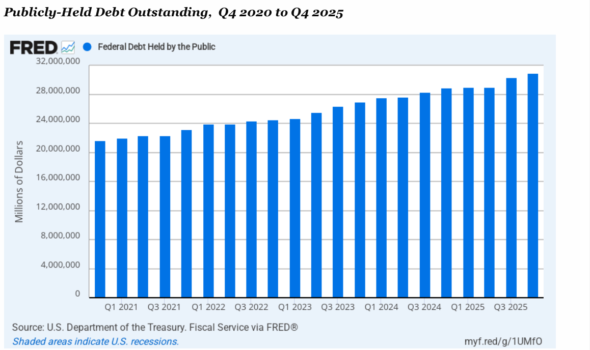 Not surprisingly, however, not withstanding yet another year of economic expansion – as tepid as it was – the publicly held debt grew by $2.0 trillion during the Donald first year back in the Oval Office, reaching $30.871 trillion by the end of Q4 2025.