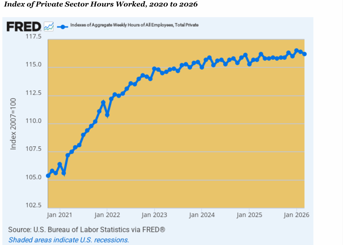 As shown below, the true employment level has gone nowhere during the Donald’s first 15 months back in the Oval Office. The hours worked index had stood at 116.1 in December 2024, which figure has remained flatter than a board, posting at 116.2 in March 2026. The gain, therefore, amounted to a scant 0.07% per annum.