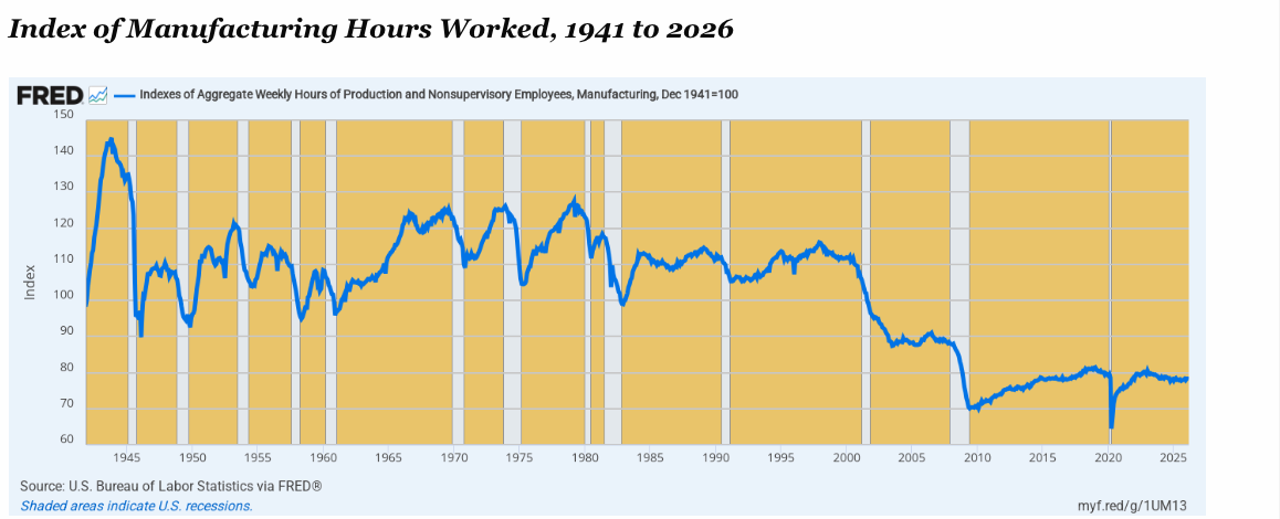 For instance, we should not be bragging after a loss of 46,000 manufacturing jobs since December 2024. And, more importantly, not when the hours put on the clocks by every hourly employee of every manufacturing plant in America—old, new, big, little or marginal – posted in March 2026 at a level fully 22% below the manufacturing hours level recorded at the time of Pearl Harbor in December 1941!