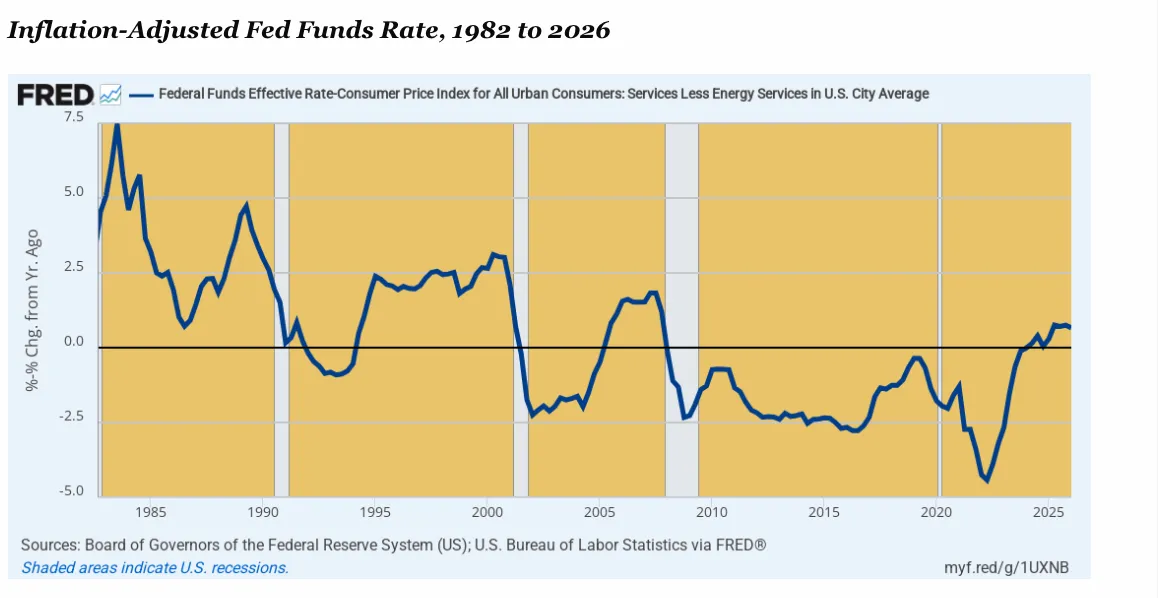 In this context, the chart below tells you all you need to know about what the Warsh Fed will be up against, and also the lessons of the 2022-2023 error by the Fed in its delayed and languid reaction to the Black Sea commodity shock. To wit, the inflation-adjusted Fed funds rate in Q2 2022 when measured by the inflation metric the Fed swears by – the domestic services CPI less energy services – -was negative -4.4%.