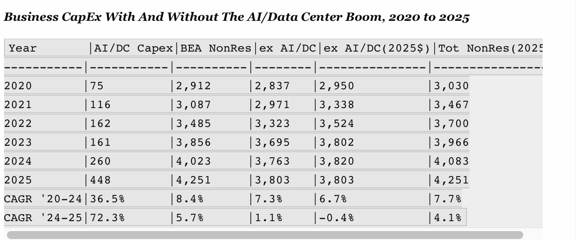The final two columns show the same data in constant dollar terms. Whereas the reported data shows that real nonresidential fixed investment investment (fifth column) rose by a seemingly robust 4.1%during Trump’s first year, capital spending excluding the AI bubble actually shrank at a -0.4% annual rate.