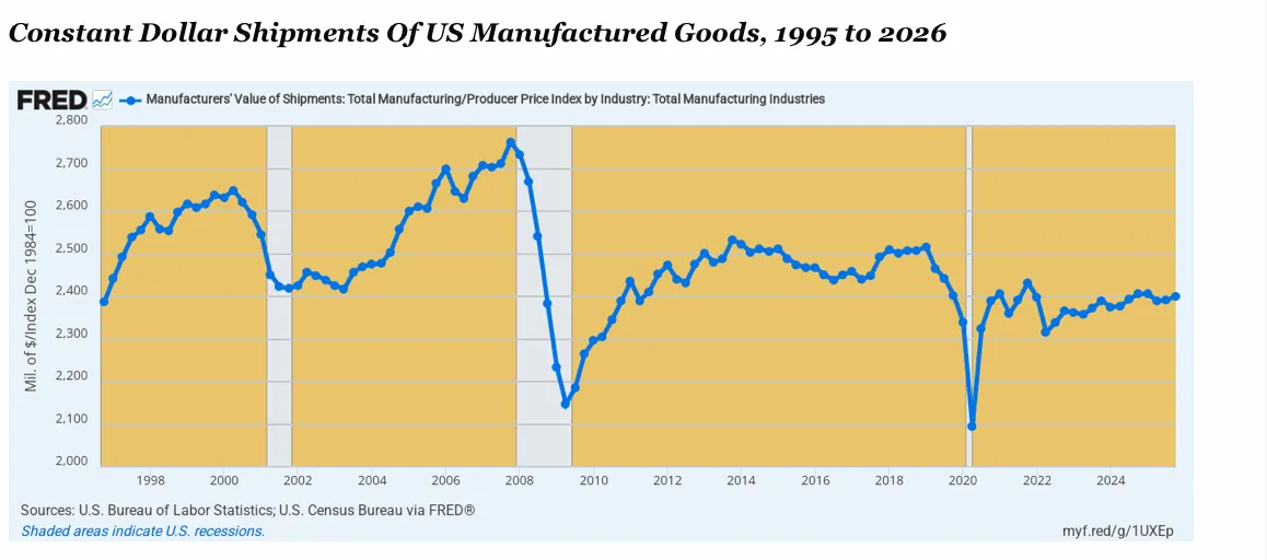 Alas, his victory on that front is about is vacuous as are his daily claims to having won the war against Iran. There is not a shred of truth to it, as the constant dollar level of manufacturing shipments depicted in the graph below clearly shows. To wit, real shipments have flat lined for years and stand 13% below their recent peak in Q4 2007.