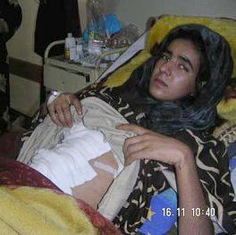 Laying in a bed near Rana is Hanna, 14 years old. She has a gash on her right leg from the bullet of a U.S. soldier. Her family was in a taxi in Baghdad this morning that was driving near a U.S. patrol when a soldier opened fire on the car.