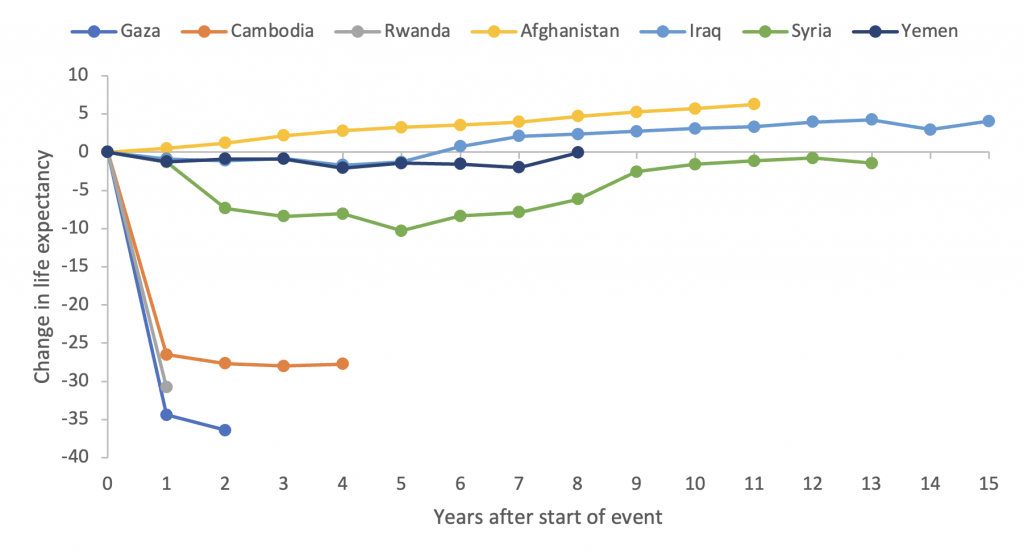 This would mean that Gaza saw a huge cumulative loss across only two years of conflict. Such a sudden and dramatic fall in life expectancy did not occur during any of the recent wars in Afghanistan, Iraq, Syria or Yemen. However, it did occur during the Rwandan and Cambodian genocides. This is shown in the chart below, using figures from Gómez-Ugarte and colleagues and Our World in Data.